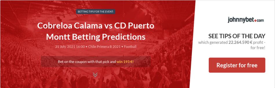 Markus25 added a bet Cobreloa Calama - CD Puerto Montt with odds and prediction 143 for Cobreloa Calama stake - 1010. 7 10 matches. Cobreloa vs Puerto Montt team performances predictions and head to head team stats for goals first half goals corners cards.